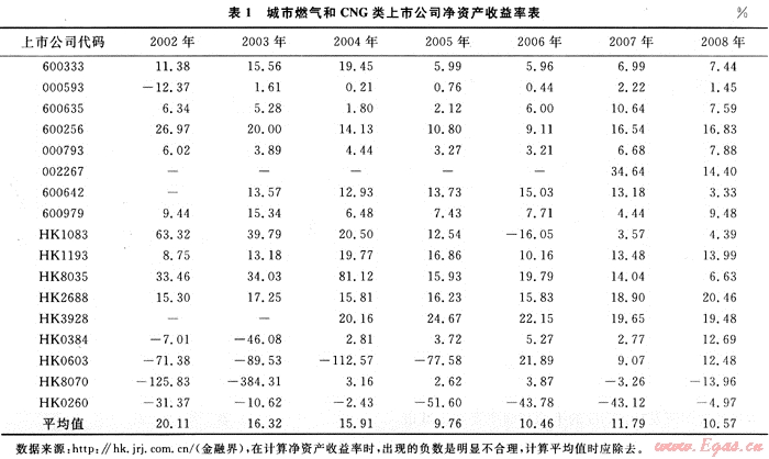 β系數(shù)的確定可從兩方面入手:第一種方法是通過建設(shè)部標(biāo)準(zhǔn)定額研究所發(fā)布的行業(yè)風(fēng)險(xiǎn)系數(shù)表中查詢[3],但該表中對(duì)石油和天然氣行業(yè)只提供了陸上油田和氣田開采、原油存儲(chǔ)設(shè)施、長(zhǎng)距離輸油和輸氣管道、海上原油開采幾個(gè)方面,且β系數(shù)均為2.24;第二種方法是通過城市燃?xì)夂虲NG上市企業(yè)的凈資產(chǎn)收益率利用公式定量計(jì)算得出。