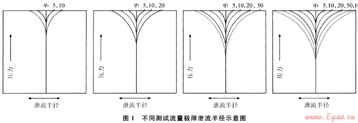 由式(2)可以看出,對每一個測試流量來說,隨著時間的進行,壓降變化越來越小,當達到一定測試時間后,由于壓降變化非常小,超出探測裝置的可探測范圍,此時可以近似看作達到相對穩(wěn)定狀態(tài),泄流半徑不再擴大,且各測試流量達到相對穩(wěn)定狀態(tài)的時間與測試流量的大小及儲層的物性密切相關,圖1表示了測試流量依次增大,其極限泄流半徑也相應增大。