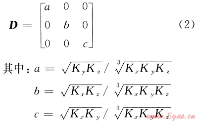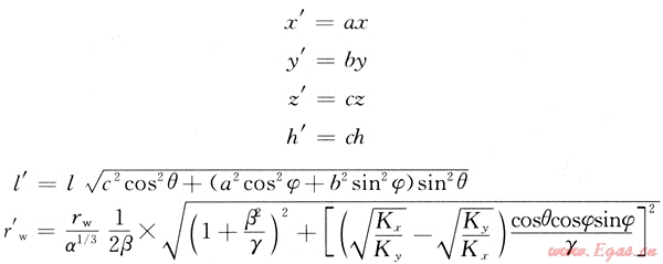 這樣,在轉(zhuǎn)換后的各向同性氣藏中各方向滲透率均相等,K=(Kx,Ky,Kz)1/3。轉(zhuǎn)換前后空間中的幾何參數(shù)發(fā)生如下改變: