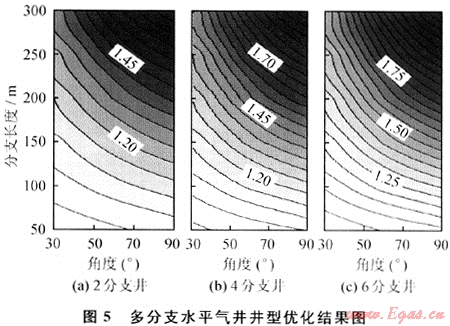 綜合來看,應(yīng)有如下優(yōu)化結(jié)論:①應(yīng)采取4分支以上的分支數(shù)目;②分支角度應(yīng)不小于30°;③分支長(zhǎng)度根據(jù)氣藏需求選用盡可能大的長(zhǎng)度。