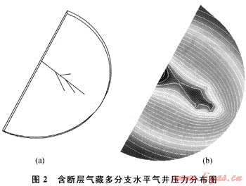 假設(shè)氣藏中存在一條不滲透邊界(圖2-a),根據(jù)滲流力學(xué)鏡像反映原理,可將斷層存在情況下1口生產(chǎn)井的情況等效為無限大地層沿?cái)鄬用鎸?duì)稱的2口生產(chǎn)井共同生產(chǎn)的情況。考慮斷層影響后多分支水平井壓力分布圖如圖2-b所示。