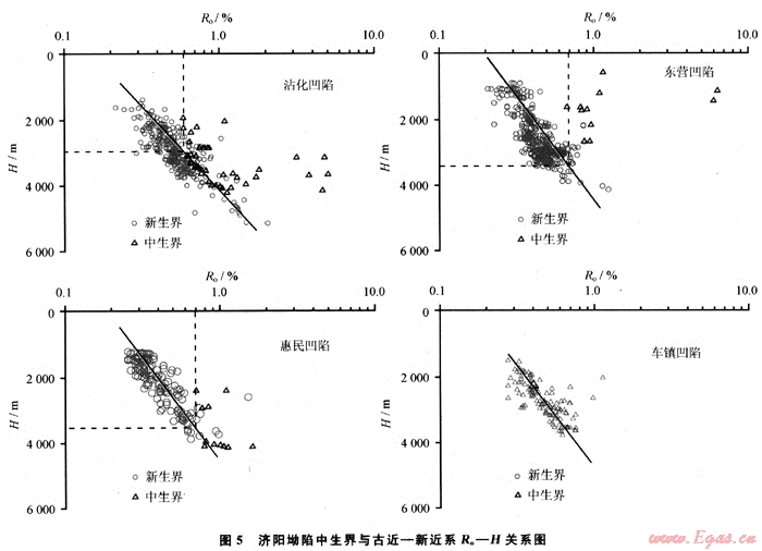 沾化凹陷中生界與新生界有機(jī)質(zhì)成熟度演化曲線相交于2900~3000m,其鏡質(zhì)體反射率在0.6左右。這表明,在新生界沉積前,中生界自身的沉積和較高的地溫梯度[9、21~23]已使烴源巖中有機(jī)質(zhì)的熱演化程度達(dá)到成熟階段。因而,通過(guò)新生代沉積進(jìn)而使中生界烴源巖再次活化生烴所需的門限深度大于3000m,Ro>0.6%(圖5)。