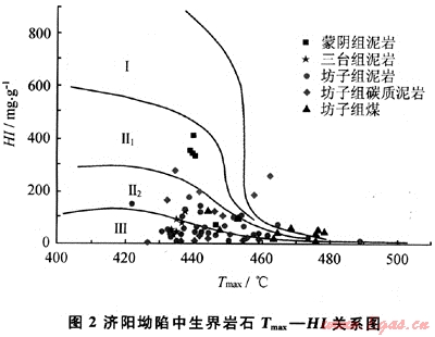 有機(jī)質(zhì)類型是評(píng)價(jià)烴源巖質(zhì)量的重要指標(biāo)。從濟(jì)陽(yáng)坳陷中生界烴源巖Tmax-HI關(guān)系圖可以看出(圖2),巖石樣品主要落在了混合型-腐殖型干酪根范圍內(nèi)。其中坊子組的泥巖、碳質(zhì)泥巖和煤的有機(jī)質(zhì)類型均以偏腐殖混合腐殖型為主,蒙陰組巖石樣品有機(jī)質(zhì)類型相對(duì)較好,樣品點(diǎn)主要落在偏腐泥混合-偏腐殖混合型范圍內(nèi),三臺(tái)組主要為腐殖型。