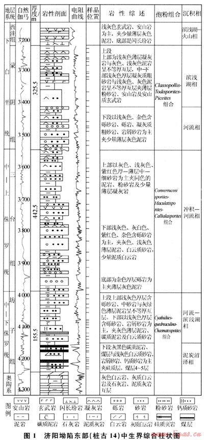 濟(jì)陽(yáng)坳陷位于渤海灣盆地東南部,是在前中生界穩(wěn)定地臺(tái)基礎(chǔ)上發(fā)育而成的一個(gè)中、新生代多旋回陸相斷陷盆地[6~8],受中生代印支、燕山多期構(gòu)造活動(dòng)的影響,濟(jì)陽(yáng)坳陷中生界缺失三疊系,自下而上沉積了中-下侏羅統(tǒng)坊子組、中 上侏羅統(tǒng)三臺(tái)組、下白堊統(tǒng)蒙陰組、西洼組和上白堊統(tǒng)王氏組[9],其中上白堊統(tǒng)王氏組分布較局限,僅在林樊家地區(qū)的林4井鉆遇,圖1為沾化凹陷典型中生界綜合柱狀圖,缺失上白堊統(tǒng)王氏組。各組之間呈角度不整合或平行不整合接觸,侏羅系與白堊系之間為區(qū)域性角度不整合接觸。