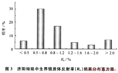 有機(jī)質(zhì)成熟度是評(píng)價(jià)烴源巖生烴量及資源前景的重要依據(jù)[18~20]。濟(jì)陽(yáng)坳陷中生界烴源巖鏡質(zhì)體反射率測(cè)試表明,中生界烴源巖中91%的樣品其有機(jī)質(zhì)已經(jīng)到達(dá)成熟演化階段,鏡質(zhì)體反射率Ro值在0.5%~1.2%之間,部分樣品的Ro值已高達(dá)2.0%以上,已進(jìn)入過(guò)成熟演化階段(圖3)。