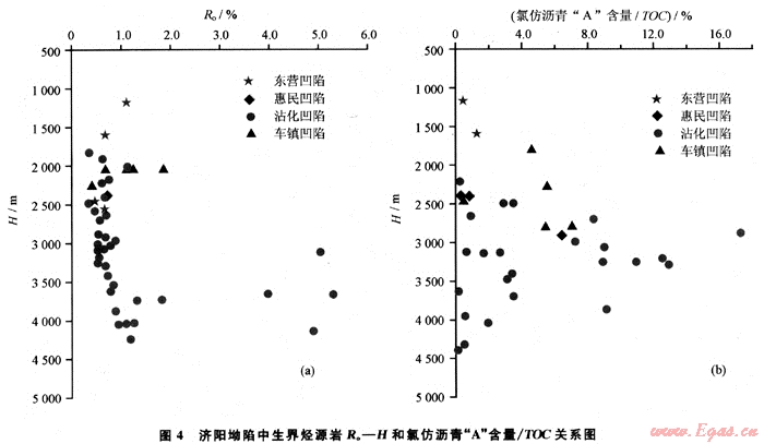 類似地,東營(yíng)凹陷中生界與新生界有機(jī)質(zhì)成熟度演化曲線相交于3500m左右,Ro為0.7%左右,中生界烴源巖再次活化生烴所需的門限深度應(yīng)低于3500m;惠民凹陷中生界與新生界有機(jī)質(zhì)成熟度演化曲線相交于3700m左右,Ro為0.7%,中生界烴源巖再次活化生烴所需的門限深度應(yīng)低于3700m。車鎮(zhèn)地區(qū)樣品有限,但從已有的樣品來(lái)看,其中生界烴源巖現(xiàn)今的熱演化程度不會(huì)太高。