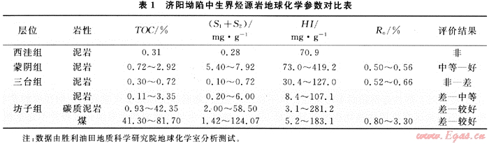 有機(jī)質(zhì)豐度是評(píng)價(jià)烴源巖非常重要的指標(biāo)之一,關(guān)系到烴源巖是否具有形成工業(yè)性油氣聚集的潛力。分析測(cè)試結(jié)果表明,濟(jì)陽(yáng)坳陷的蒙陰組與坊子組有機(jī)質(zhì)豐度相對(duì)較高(表1)。