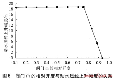 要升高系統(tǒng)動水壓線,必須關(guān)小閥門m或開大閥門n。以圖4為基準(zhǔn),此時(shí)閥門n全開,閥門m相對開度為0.931,動水壓線要上升只能關(guān)小閥門m。隨著閥門m關(guān)小,定壓點(diǎn)壓力下降,補(bǔ)水泵向系統(tǒng)補(bǔ)水,系統(tǒng)動水壓上升,直到達(dá)到圖3中的動水壓線,此時(shí)補(bǔ)水泵強(qiáng)行關(guān)閉。在此過程中,閥門m的相對開度與動水壓線上升幅度關(guān)系見圖6。由圖6可知,以閥門m相對開度0.931時(shí)為基準(zhǔn),關(guān)小閥門m,隨著系統(tǒng)補(bǔ)水,動水壓線上升。當(dāng)閥門m相對開度減小到0.750時(shí),動水壓線上升至圖3的上限,此時(shí)補(bǔ)水泵強(qiáng)行關(guān)閉,閥門m繼續(xù)關(guān)小,動水壓線也不會上升。