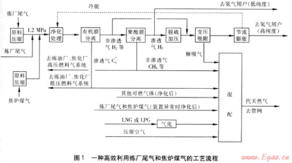 許多城市的煉油廠都與燃氣生產(chǎn)企業(yè)為鄰,甚至雙方已經(jīng)形成了良好的合作關(guān)系,附近有城市燃氣管網(wǎng),鋼鐵生產(chǎn)企業(yè)也可能與此距離不遠。照此看來,如果能將鋼鐵企業(yè)、石化企業(yè)與燃氣企業(yè)聯(lián)合起來,在兼顧各方利益的前提下,采用經(jīng)濟的方式首先提取煉廠尾氣和焦爐煤氣中的氫氣組分就近利用,之后將其他所有剩余氣體經(jīng)過簡單處理后制成符合要求的代天然氣產(chǎn)品供應(yīng)城市燃氣管網(wǎng),那么,聯(lián)合體各方就會各得其所,實現(xiàn)優(yōu)勢互補,互利互惠。在合作各方獲取效益的基礎(chǔ)上,同時使能源利用價值達到最高化,圓滿解決煉廠尾氣和焦爐煤氣中各組分物盡其用的問題。