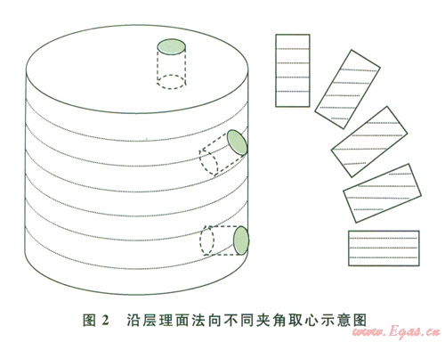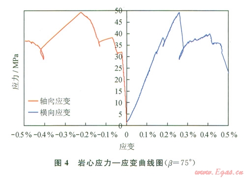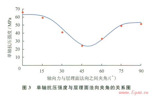 根據(jù)四川盆地某頁巖地層所取巖心進(jìn)行室內(nèi)強(qiáng)度實驗。用金剛石取心鉆頭在巖心上套取ø25 mm的圓柱試樣,將試樣兩端車平磨光后置于抗油耐壓密封套內(nèi),再裝入MTS強(qiáng)度測試高壓釜,開啟數(shù)據(jù)采集系統(tǒng),緩慢加載測試單軸抗壓強(qiáng)度。為研究層理面對頁巖強(qiáng)度的影響,按照軸線和層理面法向之間的角度(β)0°、l5°、30°45°、60°、75°、90°鉆取試樣,示意圖如圖2所示,實驗結(jié)果如圖3、4所示。
