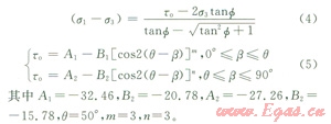 本研究簡化了JaegerMcLamore[12-13]等人建立的強(qiáng)度準(zhǔn)則,根據(jù)實驗數(shù)據(jù)采取了內(nèi)摩擦角恒定,黏聚力(τ)隨角度變化的頁巖地層強(qiáng)度公式: