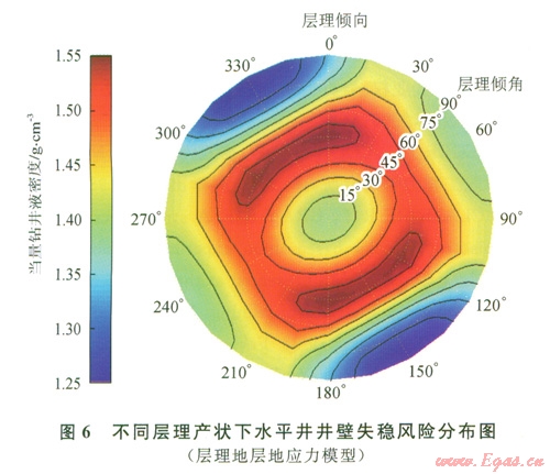 3)在鉆進(jìn)地層傾角為30°~60°之間的頁巖氣藏水平井時,應(yīng)注意具有較高的坍塌壓力。近水平和近垂直的地層中坍塌壓力有所降低,降低幅度與地層傾向有關(guān),越接近最小地應(yīng)力方向下降幅度越大。