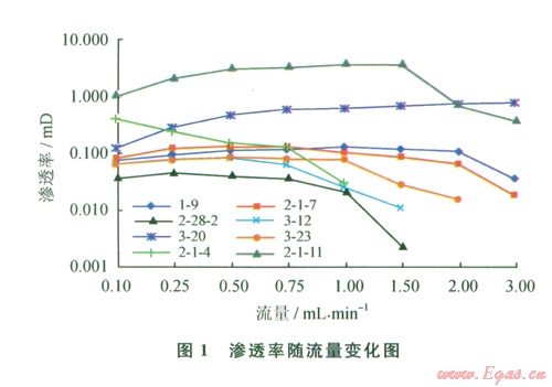 速敏性評(píng)價(jià)實(shí)驗(yàn)的目的在于了解儲(chǔ)層滲透率的變化與儲(chǔ)層中流體流動(dòng)速度的關(guān)系,評(píng)價(jià)敏感程度及臨界流速,為油氣井合理產(chǎn)量和注入速度提供依據(jù)。對(duì)8塊巖樣的實(shí)驗(yàn)分析表明:珍珠沖組儲(chǔ)層滲透率與流量的關(guān)系多樣化,有6塊巖樣滲透率在低流速段隨流速增大而增大,當(dāng)流速增大到一定程度時(shí),滲透率急劇下降,產(chǎn)生速敏性;1塊巖樣在最小流量下就產(chǎn)生了速敏效應(yīng);l塊巖樣隨著流量的增大,滲透率持續(xù)增高(圖1)。巖樣滲透率損害率為67.2%~94.1%,屬于強(qiáng)速敏的占75%;臨界流量主要在0.5~2.0 mL/min之間,折算的臨界流速為1.79~6.