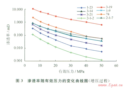 實(shí)驗(yàn)分別進(jìn)行了增壓過(guò)程和降壓過(guò)程的測(cè)試,增壓過(guò)程凈圍壓設(shè)置依次為5 MPa、10 MPa、15 MPa、20MPa、30 MPa、40 MPa、50 MPa,每一個(gè)圍壓保持30min后,測(cè)定巖心氣體滲透率;到最大壓力50 MPa以后,開(kāi)始進(jìn)行降壓過(guò)程測(cè)試,緩慢減小圍壓,使凈圍壓依次降為40 MPa、30 MPa、20 MPa、15 MPa、10 MPa、5 MPa,每一個(gè)圍壓點(diǎn)保持60 min后,測(cè)定設(shè)定凈圍壓下的巖心滲透率。