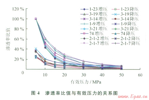 隨有效壓力的增大,巖樣滲透率急劇下降,下降幅度很大(圖3),尤其是在低壓力區(qū)間。以第一個(gè)壓力點(diǎn)(5 MPa)的滲透率為初始滲透率,計(jì)算不同有效壓力下滲透率與初始滲透率的比值——滲透率比,對(duì)全部實(shí)驗(yàn)數(shù)據(jù)進(jìn)行分析可以看出,當(dāng)有效壓力由5 MPa增大到20 MPa時(shí),滲透率下降為初始值的ll.0%~29.4%,平均為20.2%,即滲透率下降了約4/5;當(dāng)有效壓力增大到50 MPa時(shí),滲透率下降為初始值的1.10%~7.04%,平均為3.73%,即剩余滲透率都低于10%,表明滲透率的下降幅度非常大,應(yīng)力敏感性強(qiáng)。