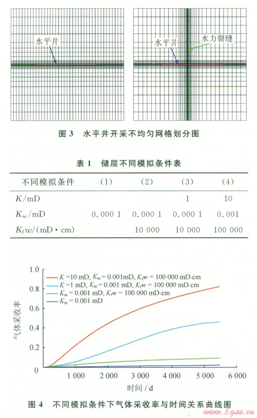 模擬結(jié)果表明,對(duì)于滲透率極低的頁(yè)巖氣藏,基質(zhì)滲透率和裂縫導(dǎo)流能力具有極端重要性;若不對(duì)儲(chǔ)層進(jìn)行壓裂改造,氣體采收率很低,不足5%,必須進(jìn)行壓裂才能得到有效開(kāi)采;頁(yè)巖氣藏一般天然微裂縫發(fā)育,對(duì)儲(chǔ)層進(jìn)行水力壓裂若不能使得天然裂縫得到有效連通,增產(chǎn)效果不明顯,采收率只有10%;若對(duì)儲(chǔ)層實(shí)施大規(guī)模的壓裂改造,進(jìn)行體積壓裂形成復(fù)雜縫網(wǎng),則可以有效提高儲(chǔ)層裂縫的連通性和流體的流動(dòng)能力,氣體采收率可達(dá)80%。