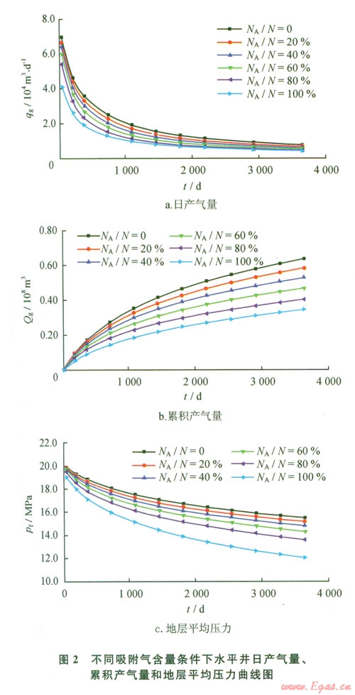 圖2給出了不同吸附氣含量條件下頁巖氣水平井的日產(chǎn)氣量、累積產(chǎn)氣量和地層平均壓力曲線。由圖2可知:吸附氣含量直接影響氣井的初始產(chǎn)量和遞減速度。吸附氣含量由0至100%時,對應(yīng)的初始產(chǎn)氣量分別為6.97×