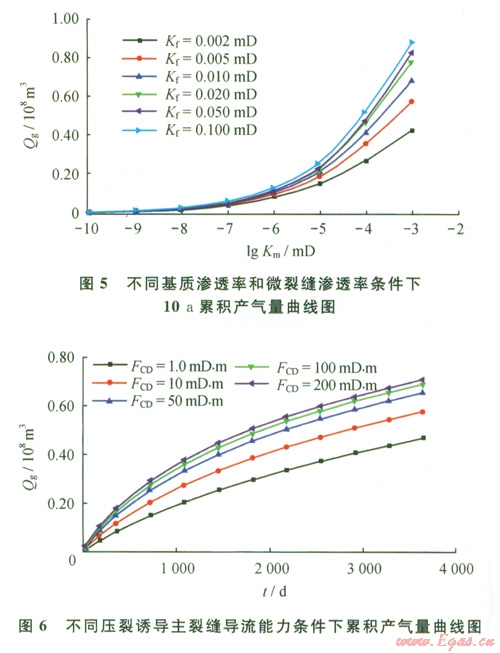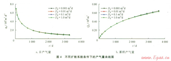圖4給出了不同級別擴散系數(shù)條件下頁巖氣水平井的日產(chǎn)氣量和累積產(chǎn)氣量曲線,由圖4可知:氣體擴散系數(shù)由