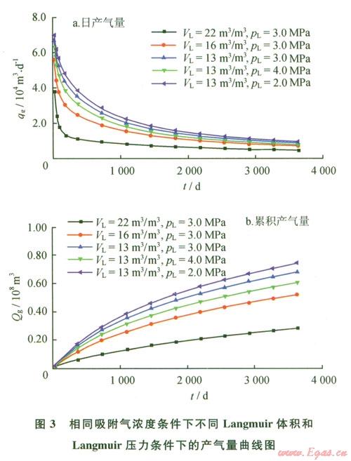 圖3給出了相同吸附氣濃度和開發(fā)條件下,不同Langmuir體積(VL)和Langmuir壓力(pL)對應(yīng)的日產(chǎn)氣量和累積產(chǎn)氣量。吸附氣濃度相同時,隨Langmuir體積和Langmuir壓力增加,頁巖氣水平井初始產(chǎn)氣量和相同開發(fā)時間累積產(chǎn)氣量逐漸降低,產(chǎn)量遞減速度加快。吸附氣濃度相同時,Langmuir壓力和Langmuir體積直接影響吸附氣開始解吸附的條件。