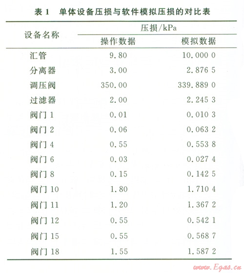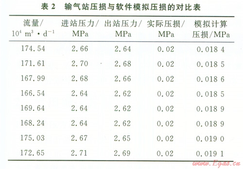 通過輸氣站過程模擬軟件的模擬計(jì)算,將計(jì)算結(jié)果與各主要生產(chǎn)設(shè)備的實(shí)際壓損數(shù)據(jù)進(jìn)行對比,選擇其中具代表意義的單體設(shè)備分析結(jié)果列于表1。同時(shí),將軟件模擬的全流程參數(shù)計(jì)算所得的站內(nèi)壓損與該站實(shí)際生產(chǎn)中的壓損數(shù)據(jù)進(jìn)行比較列表,結(jié)果如表2所示。