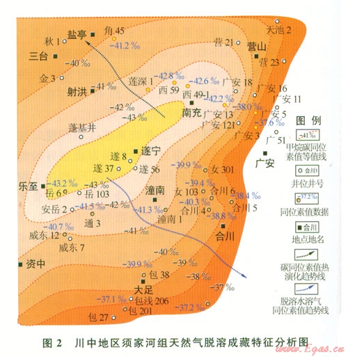 四川盆地中部地區(qū)須家河組地層中水溶氣脫溶聚集與側向運移的現(xiàn)象也很明顯。該區(qū)在廣安、合川、安岳等地探明天然氣地質儲量超過4 000×