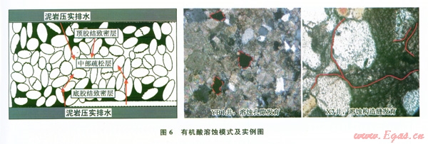 晚期有機(jī)酸溶蝕作用是指在須三段泥巖壓實(shí)過程中排出的有機(jī)酸對(duì)鈣屑砂巖中的碳酸鹽鹽巖膠結(jié)物以及碳酸鹽巖碎屑顆粒進(jìn)行溶蝕,形成溶蝕裂縫及溶蝕孔隙(圖6)。