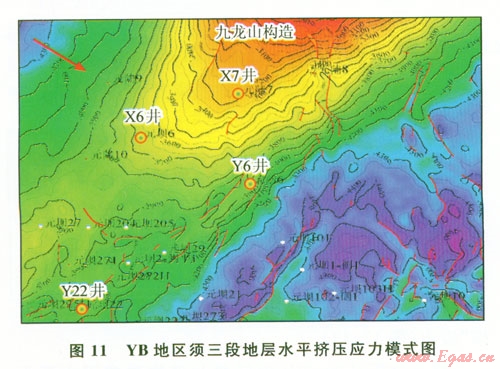 YB構(gòu)造位于四川盆地北部,地處龍門山前、米倉(cāng)山前、大巴山前推覆褶皺帶交合處,具有三重構(gòu)造應(yīng)力擠壓背景。元陸7井附近地層屬于九龍山構(gòu)造西南翼斜坡帶,其構(gòu)造應(yīng)力主要來(lái)源于龍門山南東向的水平構(gòu)造擠壓應(yīng)力以及大巴山縱向擠壓造成的膏鹽巖“上拱”應(yīng)力(圖11、12)。
