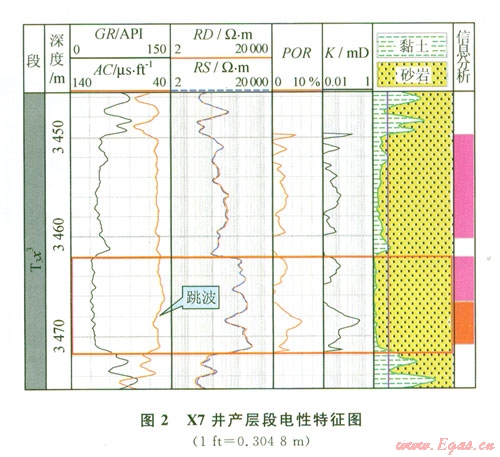 X7井須三段產(chǎn)層段砂體表現(xiàn)為很低的伽馬值(30API),測(cè)井電阻率遠(yuǎn)遠(yuǎn)高于上部砂體(800~1 000 Ω· m),反映砂體致密,并且含有較多的鈣質(zhì)碎屑,低聲波時(shí)差55μs/ft(