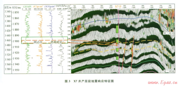 通過合成地震記錄標(biāo)定,確定X7井須三段鈣屑砂巖儲(chǔ)層為強(qiáng)振幅地震反射特征,砂體頂?shù)追謩e對(duì)應(yīng)強(qiáng)波峰或者強(qiáng)波谷;地震剖面上測(cè)試段砂體表現(xiàn)為“透鏡狀”反射特征,表明砂體為分流主河道砂體;X7井測(cè)試段東部
