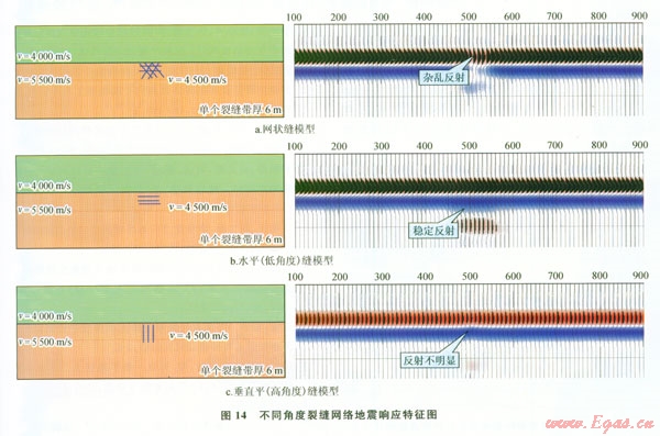 通過不同類型裂縫網(wǎng)絡(luò)模型正演(圖14):網(wǎng)狀裂縫具有典型的雜亂反射特征,而近水平裂縫表現(xiàn)為穩(wěn)定強(qiáng)反射特征,高角度垂直縫沒有明顯地震響應(yīng)。因此,利用“雜亂反射”屬性進(jìn)行須三段裂縫預(yù)測(cè)。
