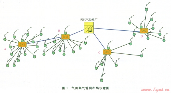 根據(jù)各氣區(qū)單井分布情況,氣田總體上采取多井集氣方案,采用放射狀敷設(shè)管道和多井集氣工藝。氣田集氣官網(wǎng)布局見圖1。