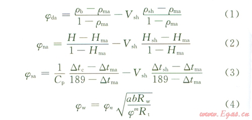 由泥質砂巖體積模型可寫出地層流體為淡水時地層視密度孔隙度(φda)、視中子孔隙度(φna)、視聲波孔隙度(φsa)和含水孔隙度(φw),即