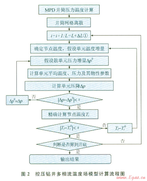 ①對全井筒進(jìn)行離散處理;②確定初始節(jié)點(diǎn)溫度Ti°,假設(shè)離散單元體溫度增量;③假設(shè)單元體壓降;④在平均溫度、壓力下計(jì)算單元體氣液物性參數(shù);⑤利用井筒多相流流動(dòng)分析模型計(jì)算離散單元壓降;⑥判斷計(jì)算的壓降和假設(shè)壓降是否滿足精度要求,不滿足就返回第③步重新計(jì)算,否則進(jìn)行下一步;⑦應(yīng)用井筒傳熱方程及能量方程計(jì)算離散單元節(jié)點(diǎn)溫度;⑧判斷計(jì)算的離散單元溫度和假設(shè)溫度是否滿足精度要求,不滿足就返回第②步重新計(jì)算,否則進(jìn)行下一步;⑨增加步長到計(jì)算井深,輸出結(jié)果。