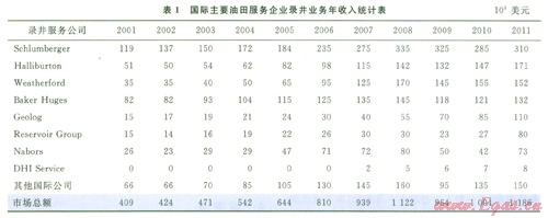 國際錄井行業(yè)長期以來是一個多頭競爭行業(yè),主要有斯倫貝謝(Schlumberger)、貝克休斯(Baker Huges)、哈里伯頓(Halliburton)、納伯斯(Nabors Industries)、威德福(Weatherford)等。由于錄井行業(yè)技術(shù)門檻低、投入少、風(fēng)險低,小公司進(jìn)入比較容易,因此競爭比較激烈。另一方面,大的油田服務(wù)公司主要側(cè)重于鉆井、隨鉆測井、鉆井液、電纜測井、連續(xù)油管等高利潤行業(yè),沒有把發(fā)展重點投向錄井行業(yè),因此沒有形成個別公司絕對控制的局面,市場份額也比較分散(見表1,市場總額中不包含中國錄井企業(yè)的國內(nèi)產(chǎn)值,2010年約50億元人民幣)。