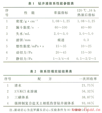 考慮體系總固相含量控制的要求和強(qiáng)抑制性的需要,重點(diǎn)研究了可溶性有機(jī)鹽、無機(jī)鹽在提高液相密度和鉆井液抑制性的作用,體系防塌實(shí)驗(yàn)結(jié)果見表2。有機(jī)鹽溶液自身具有較高的密度,僅其水溶液密度就可超過1.25 9cm3,復(fù)配使用無機(jī)鹽就可以提高體系的抑制性,以滿足防塌的要求。另外輔以G302-SZD等即可形成具有較好封堵作用的濾餅,進(jìn)一步提高體系的防塌效果。
