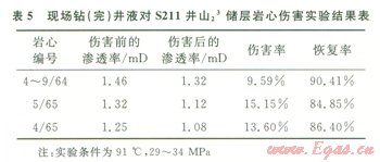 從表5中可以看出,現(xiàn)場鉆井液完井液對(duì)山23儲(chǔ)層傷害較低,且傷害后恢復(fù)率可達(dá)84.85%以上,這表明恢復(fù)性良好,具有很好的暫堵保護(hù)作用,兩口井試產(chǎn)都獲高產(chǎn)。