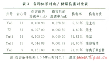 從表3中實(shí)驗(yàn)數(shù)據(jù)可以看出,對(duì)比的幾種常用鉆井液完井液體系中,無土相低傷害暫堵鉆井液完井液體系的靜態(tài)傷害率最小,小于10%,屬于較輕度傷害。