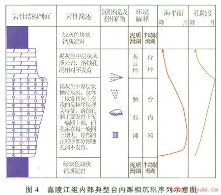 區(qū)域地質(zhì)研究表明,川南地區(qū)嘉二時(shí)期發(fā)生了—次大規(guī)模的海退,嘉二1亞段沉積時(shí)水體變淺,波浪作用相對(duì)較強(qiáng),由于臺(tái)地內(nèi)部古地形的起伏不平,發(fā)育于局部水下高地或隆起的臺(tái)內(nèi)灘相為本區(qū)高能環(huán)境下的產(chǎn)物。其顆粒組分含量高,巖石類型主要有中薄層—中厚層粉晶殘余砂屑有孔蟲白云巖、中厚層生屑砂屑灰云巖、厚層礫砂屑灰云巖或云巖、厚層殘余鮞?;?guī)r和粉晶殘余砂屑灰?guī)r。剖面結(jié)構(gòu)上,以向上變淺序列發(fā)育為主要特征,旋回底部為開闊潮下、局限瀉湖、半局限瀉湖或?yàn)╅g海沉積,巖性為暗色泥巖、白云巖或石灰?guī)r以及它們的過渡巖類;由于等效海退的影響,剖面中部巖性為較高能的鮞?;?guī)r或云巖、砂屑灰?guī)r或云巖等,粒徑向上變粗;旋回上部,由于灘體的生長速度大于海平面相對(duì)上升速度,沉積界面很快位于平均海平面附近,巖性以云質(zhì)灰?guī)r、白云巖和膏鹽巖為特征(圖4)。