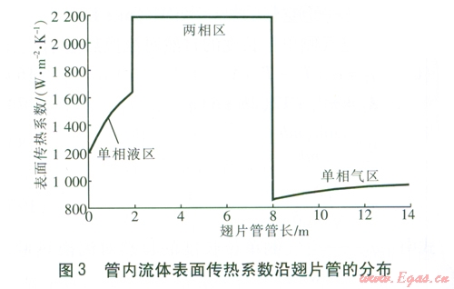 管外壁溫度在單相液區(qū)急劇升高,到達兩相區(qū)后有一個突降,而后保持不變,到達缺液區(qū)后逐漸升高,在單相氣區(qū)也是緩慢升高。由管外壁溫度沿翅片管的分布可以看出,在單相液區(qū)和兩相區(qū)的核態(tài)沸騰區(qū),即從人口至管長大約6m處,管外壁溫度較低,容易發(fā)生結露或結霜現象。