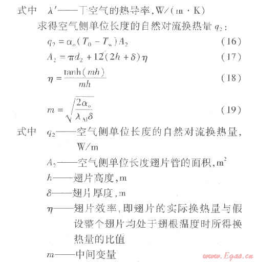 空氣側換熱可看作大空間自然對流換熱,單個翅片的換熱可以看作空氣與等截面直肋的換熱。