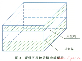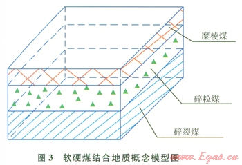 當(dāng)煤層段形成過程、形成后遭受的構(gòu)造運(yùn)動(dòng)強(qiáng)烈程度不同時(shí),導(dǎo)致煤層段巖石力學(xué)性質(zhì)差異性較大時(shí),即軟煤(碎粒煤和糜棱煤)和硬煤共存,第一次壓裂時(shí),大部分壓裂液進(jìn)入軟煤,壓裂效果不甚理想,為了在硬煤中進(jìn)行壓裂,則需要使用投球技術(shù),此類情況的地質(zhì)概念模型如圖3所示。