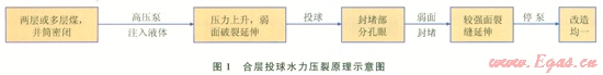 合層投球水力壓裂是基于間距較小、非均質(zhì)性差異相對(duì)比較大的兩層或多層煤為前提,把井筒作為一個(gè)密閉系統(tǒng),通過地面高壓泵把液體注入井筒,當(dāng)達(dá)到煤層某些地方的破裂壓力時(shí),首先破裂進(jìn)行延伸,為防止裂隙閉合,并進(jìn)行加支撐劑操作來支撐裂縫。因煤儲(chǔ)層非均質(zhì)性強(qiáng),巖石力學(xué)性質(zhì)差異性大,勢(shì)必造成在煤層某些段裂縫延伸較遠(yuǎn),某些煤層段裂縫延伸較近,為了限制這些裂縫延伸遠(yuǎn)的繼續(xù)延伸,同時(shí)使裂縫延伸近的能夠進(jìn)一步延伸擴(kuò)展,此時(shí)投入一定數(shù)量的尼龍球(也可以是其他材料制作的球),把裂縫容易延伸的那部分孔眼堵塞,迫使施工壓力和有效排量發(fā)生改變,達(dá)到改造初始裂縫延伸距離近的那部分層段的目的。因此,能否使初始裂縫延伸近的層段進(jìn)一步得到改造,合理的投球數(shù)是決定因素。其壓裂原理如圖1所示。