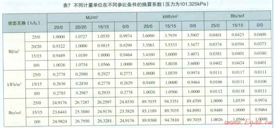 在計(jì)算熱值和華白數(shù)時(shí),有些地區(qū)和國(guó)家常采用的參比條件為60℉、60℉、14.73psi,由表5可以換算為15.6℃、l5.6℃、l01.586kPa,通過氣體狀態(tài)方程PV=nRT計(jì)算,基本可以認(rèn)為該參比條件等同于15℃、l5℃、101.325kPa。因此在實(shí)際應(yīng)用中,建議直接用后者進(jìn)行不同參比條件的換算。