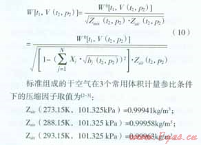 由于天然氣組分主要以甲烷為主,占總組分的80%-1 00%,而c3一c7等重烷烴組分比例很小,因而,結(jié)合表4和空氣壓縮因子Zair(t2,P2)數(shù)值,可以將式(10)簡(jiǎn)化為: