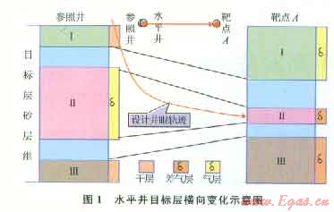 蘇里格氣田儲層非均質(zhì)性強(qiáng),作為水平井目標(biāo)層大多由多套含氣單砂體所組成,它們之間或由泥質(zhì)薄夾層所分隔,或由儲層物性變化所形成的致密夾層所隔離,時(shí)常遇見靶點(diǎn)A處目標(biāo)砂層組與參照井不一樣的特殊情況,即同一單砂體厚度變薄或增厚,含氣性變差或變好,泥質(zhì)夾層變厚或減薄等。而設(shè)計(jì)一般都選擇參照井厚度大、含氣性好的單砂體作為人靶位置。如果遇見入靶點(diǎn)位置目標(biāo)層發(fā)生較大變化,不進(jìn)行調(diào)整仍按原設(shè)計(jì)靶點(diǎn)入靶,則存在原目標(biāo)砂體相變或尖滅風(fēng)險(xiǎn)(圖1),如何保證水平井人靶是優(yōu)化的內(nèi)容之一。