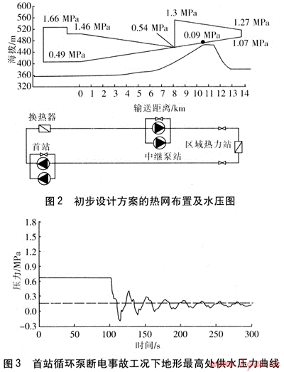 按靜態(tài)水力分析,初步設(shè)計方案是合理的,最大壓力在首站處(壓力為1.66MPa),外部管網(wǎng)靜態(tài)運行壓力小于1.6MPa。動態(tài)水力分析顯示,初步設(shè)計方案的設(shè)計、運行易由于壓力的大幅度波動產(chǎn)生超壓或汽化,導(dǎo)致嚴(yán)重的安全問題。為提高輸送干線的安全性,需對初步設(shè)計方案進(jìn)行改進(jìn):提高設(shè)計壓力,取消中繼泵站,系統(tǒng)最大壓力為2.5MPa;在首站處供水溫度提高為135℃,回水溫度不變,供回水溫差加大5℃,流量減小8%;首站循環(huán)泵采用兩級泵形式,保證控制的穩(wěn)定性。改進(jìn)設(shè)計方案的熱網(wǎng)布置及水壓圖見圖5。