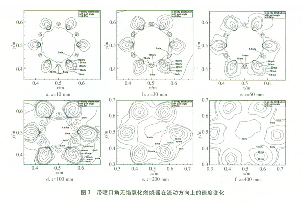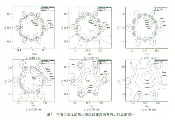 圖4給出了帶噴口角無焰氧化燃燒器溫度沿燃燒器軸線方向的變化情況。從圖4a可看出,燃燒器區(qū)域的最高溫度1 700 K位于空氣射流的某個半徑處,這表示空氣射流卷吸其附近的天然氣和燃燒產(chǎn)物使氧化劑、燃料和產(chǎn)物的比例在該空氣射流半徑處達到最佳的狀態(tài)。燃燒首先在那里發(fā)生,朝空氣射流中心的周圍擴散。當(dāng)流動進一步向下游推進時,燃燒強度進一步增加,溫度逐漸上升,最高溫度大約出現(xiàn)在z=100 mm處。在z=100mm之后,由于燃料大部分被燃燒,溫度又開始逐漸降低,并且由于混合更充分,溫度也變得更均勻。另外,由于噴嘴沿軸心具有向外的傾角,沿著軸線方向射流問的間隔也變得越大(即從射流整體運動來看,它像一個圓錐擴展運動,因此沿著石方向,即圓錐軸線方向,在圓錐橫截面上的各分射流間隔越來越大),在空氣射流和燃料射流混合之前,它們更充分地被燃燒產(chǎn)物所稀釋,燃燒區(qū)域更大,因此最高溫度也較低。