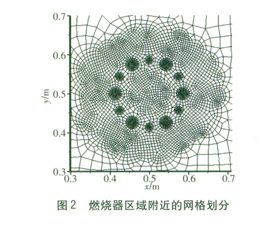 數(shù)值求解的精度與網(wǎng)格的類型和密度緊密相關(guān)。本研究中燃料口和空氣口的尺寸與整個爐膛的尺寸相比很小,由于在燃燒器內(nèi)同時進行著流動、傳熱和化學(xué)反應(yīng),因此在此附近區(qū)域的熱力參數(shù)變化激烈,此區(qū)域的網(wǎng)格必須有更小的尺寸以適應(yīng)參量的劇烈變化。圖2為主流方向某個面上燃燒器附近區(qū)域的網(wǎng)格劃分。