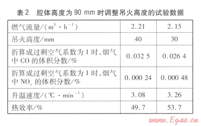 吊火高度過低則排煙不暢,影響一次空氣的引入而導致煙氣中的C0含量偏高;吊火高度過高,煙氣中的C0含量雖然低,但影響了熱效率。因此,在保證煙氣中C0含量達到相關標準的前提下,應盡可能降低吊火高度。經試驗得出,吊火高度取3040 mm比較合適。