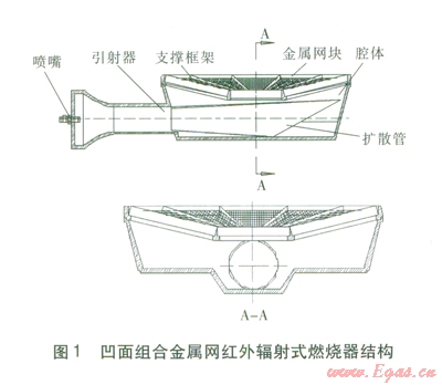 燃燒器主要由引射器、火蓋和腔體三部分組成。引射器包括噴嘴、喉管、擴散管。火蓋由金屬網塊和支撐框架組成。腔體采用中心下凹狀結構,擴散管設置在下凹腔體內。這既縮小了腔體的體積,又能容納引射器擴散管且不影響擴散管的功能。凹面組合金屬網紅外輻射式燃燒器結構見圖l